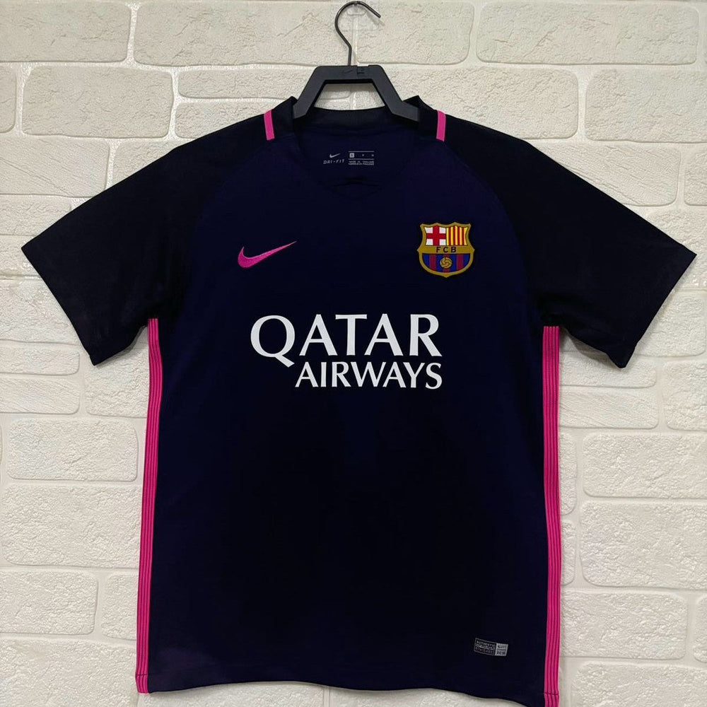 Step back into the 2016-17 season with this iconic FC Barcelona Away Jersey. Designed by Nike, this kit features a sleek dark navy base with striking pink accents along the sides and collar, perfectly blending style and performance. The front proudly displays the Qatar Airways sponsor logo, the bold Nike swoosh in pink, and the legendary FC Barcelona crest on the chest.