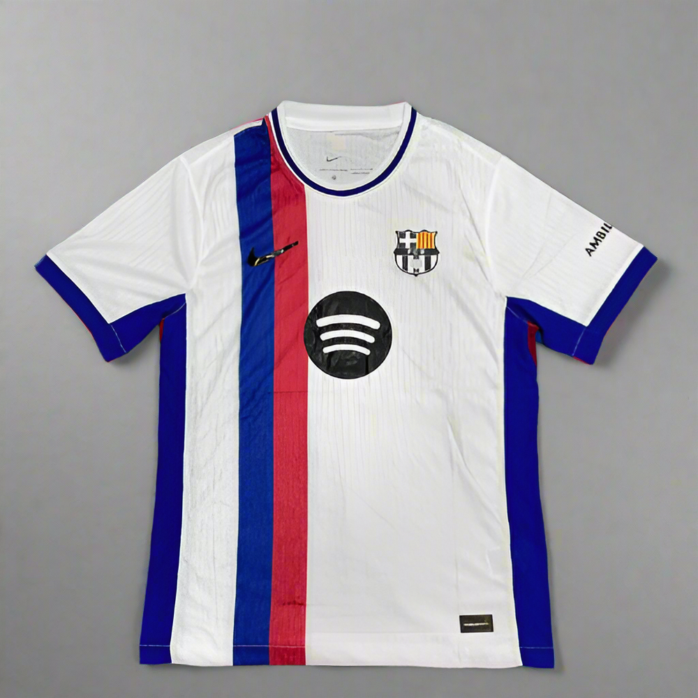 Celebrate the Blaugrana spirit with the Barcelona White Special Edition Jersey 25 26 PLAYER VERSION, designed by Nike for the new season. Featuring a striking white base with bold vertical red and blue stripes, this jersey reflects Barça’s pride and heritage in a modern style.