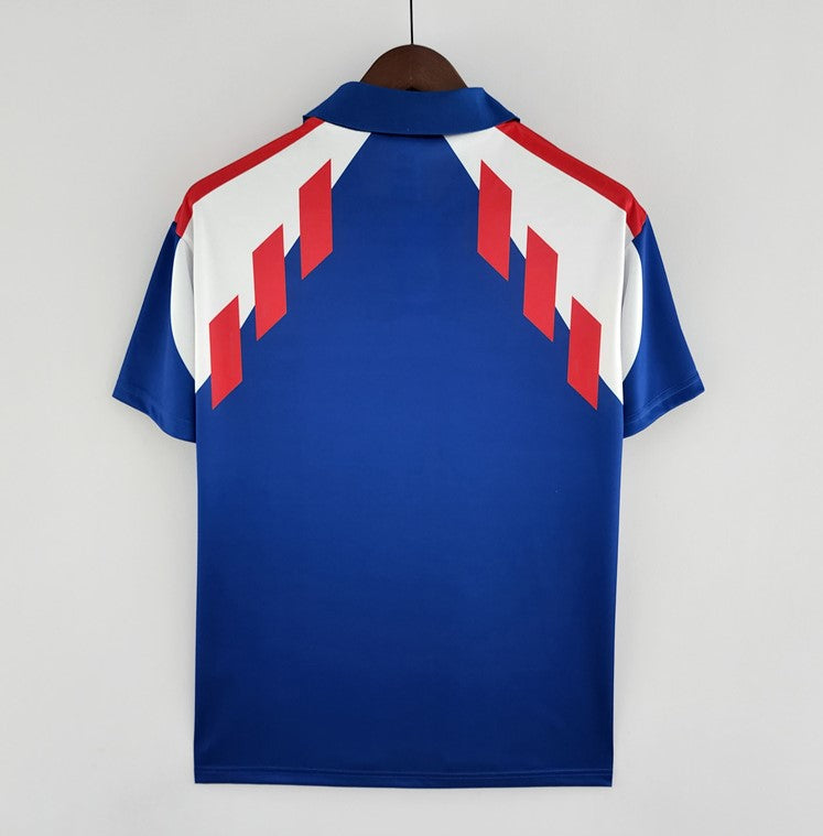 Bring back the golden era of French football with the France 1990 Home Retro Jersey. This classic jersey recreates the bold blue design with iconic red and white geometric patterns that made the early 90s kits unforgettable.
