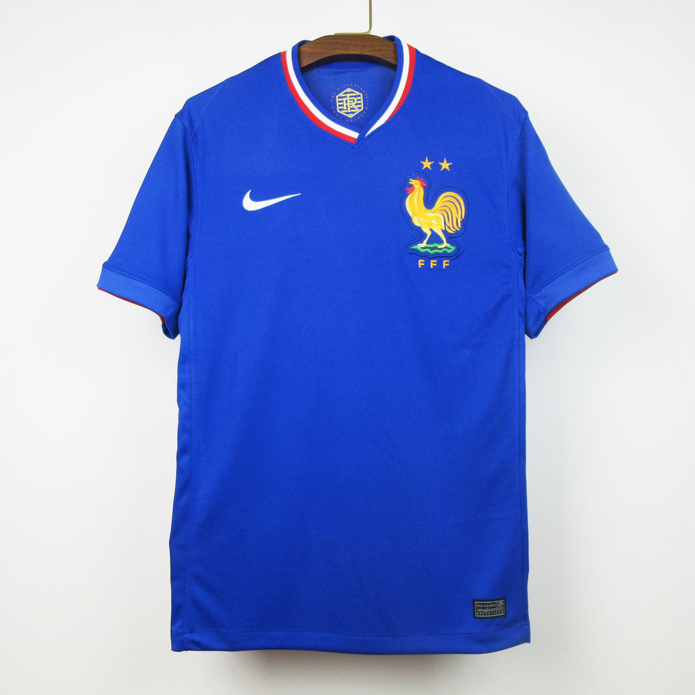The Nike France 2024 home shirt has a classic yet stylish design. It is mainly "Bright Blue", shifting away from the 2022 navy color scheme. Combined with this shade of blue are "University Red" and white. What is most remarkable about the France 2024 home kit is probably the crest. After the monochrome approach of all previous Nike France kits, the Swoosh launches a new classic color scheme of the famous FFF logo.