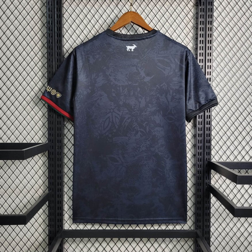 The Nike Portugal Euro 2024 home jersey features the classic red color of the country but combined with other colors than in the past few years. It is mainly red, combined with green and black applications, plus a light beige for the Sowoosh, as well as the names and numbers. Officially, the colors are "University Red/Pine Green/Sail". Portugal's Euro 2024 home kit has a black offset collar with green detailing. Nike uses no graphic design for the Portugal 2024 home kit, letting the colors stand out. Inside the collar is a special Portugal lettering.