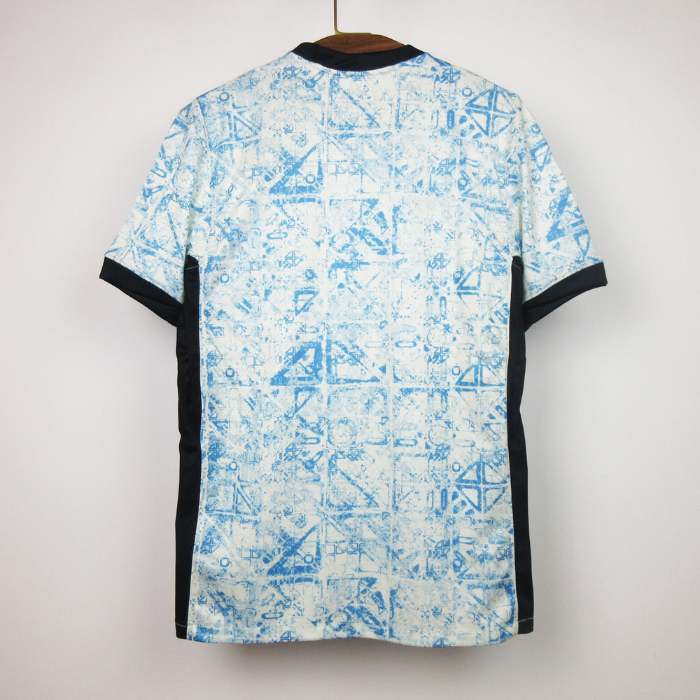 The Nike Portugal 2024 away shirt boasts a design closely connected to Portugal's history. The kit features an all-over graphic with an Azulejo-style pattern that has a grungy effect to it. Azulejo is a form of Portuguese and Spanish tin-glazed ceramic tilework. It is usually used for decorating walls and floors and is known for its bright colors and intricate designs. In terms of the colors, Nike continues the color scheme of the 2022 World Cup away shirt. Like the shirt for Qatar, the new Portugal 2024 away kit is mainly Sail. Nike combines the Portugal Euro 2024 away football shirt with light blue and a very dark navy, "University Blue" and "Pitch Blue".